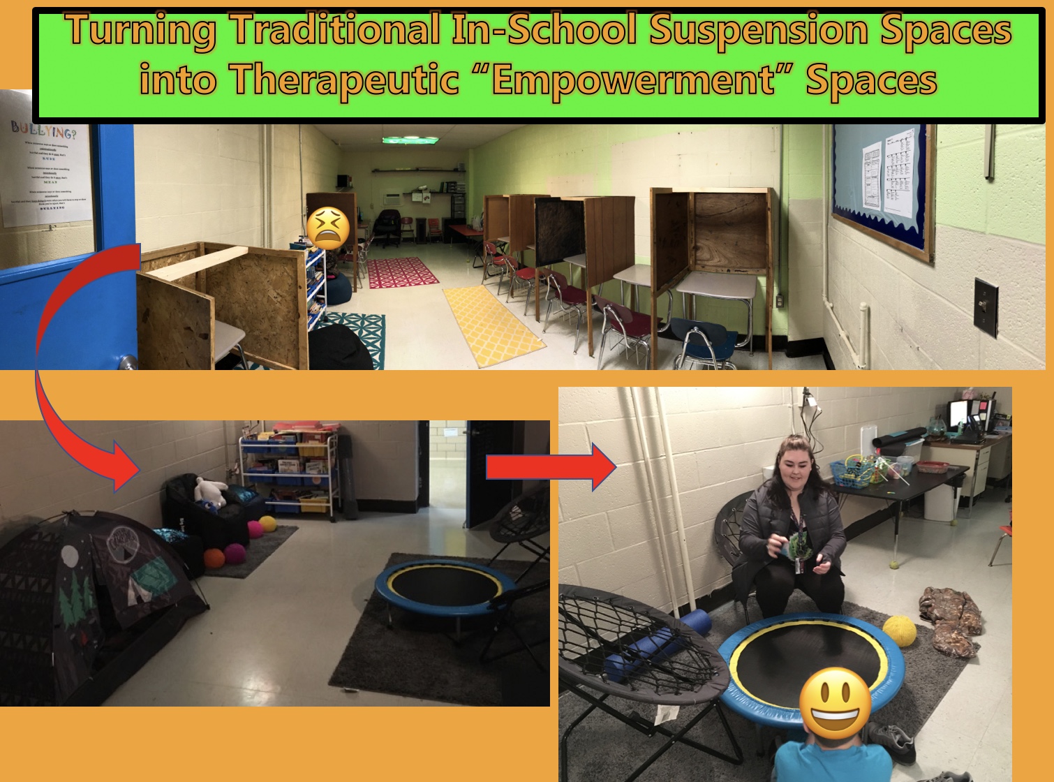 The team was tasked to design & model mindfulness programs. This led to the creation of safe or brave spaces (some call these sensory centers) throughout our campuses. Our in-school suspension rooms transitioned into restorative spaces in what I called the “Bruce Perry’s Sequence of Engagement & Neurosequential Intervention Model Room” layout. In other words, these therapeutic spaces were re-designed and organized for three specific purposes: Regulate, Relate, & Reason. The intent of these therapeutic rooms was not only to service Tier 2/3 students, but also serve as a working professional development model for the rest of the teaching staff (universal practices).